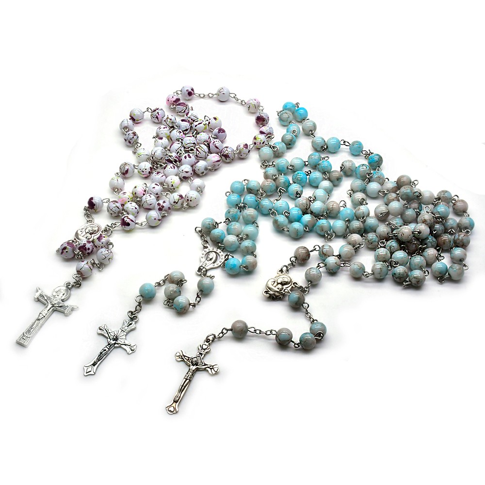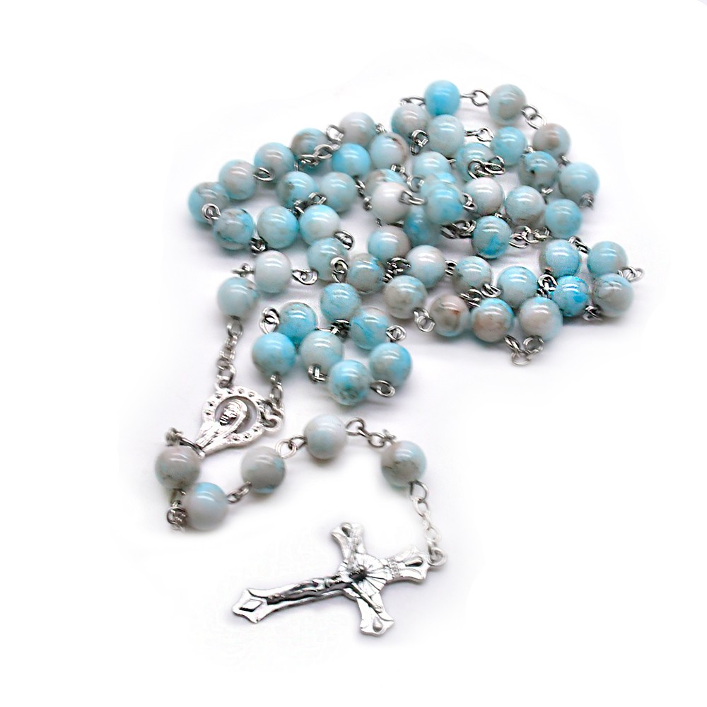 跨境电商圣母宝蓝色念珠项链十字架饰品