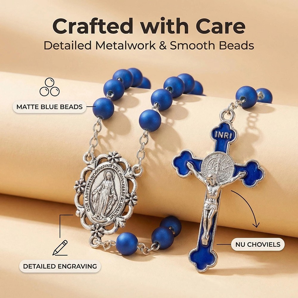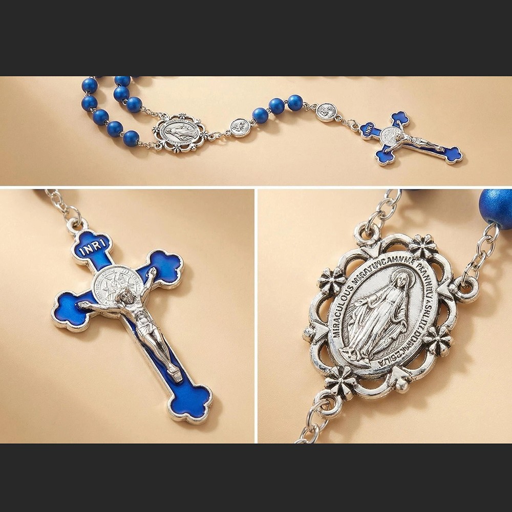 跨境电商圣母宝蓝色念珠项链十字架饰品