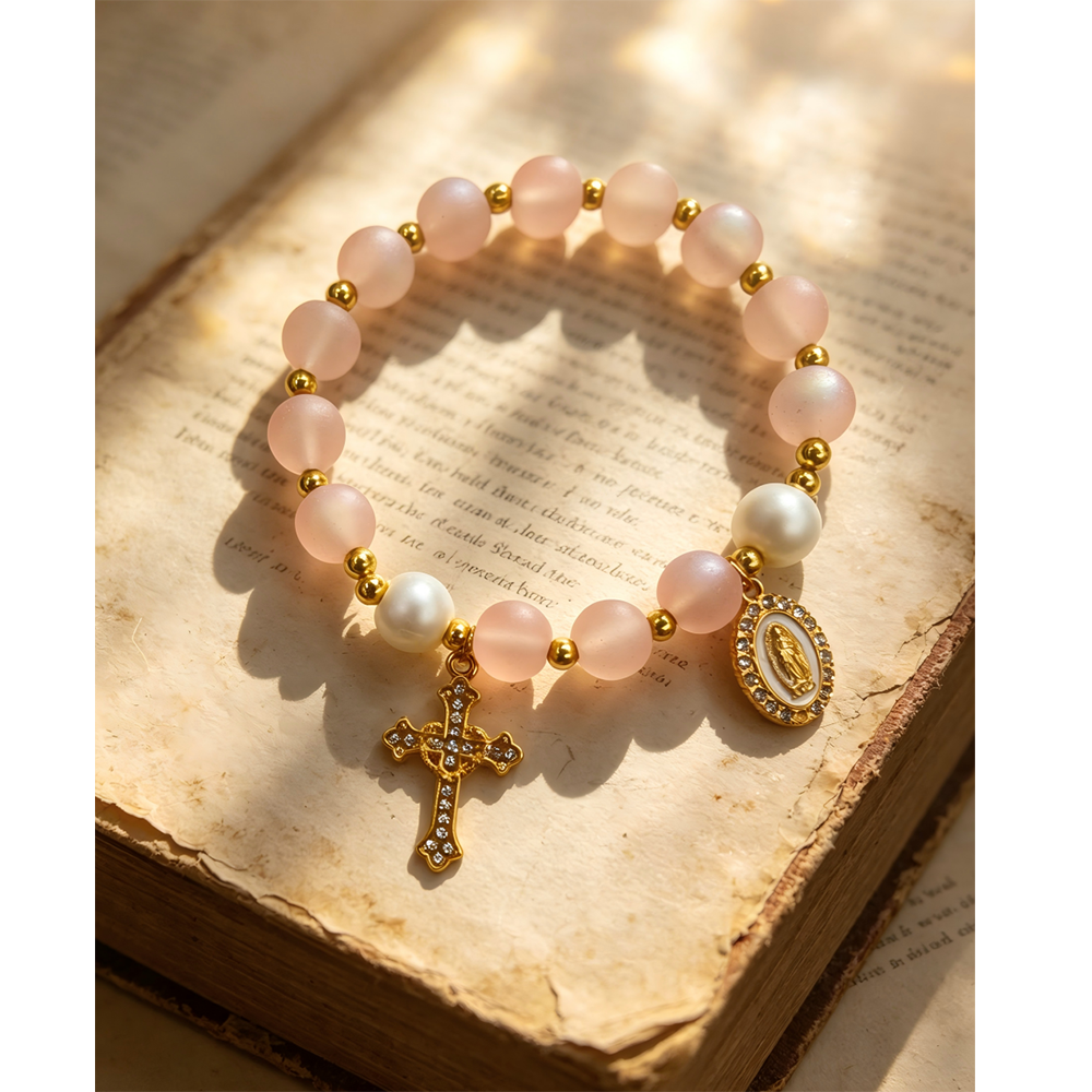 (粉色)磨砂珠玫瑰经念珠手链 镀金镶钻爱心十字架饰品 洗礼礼物