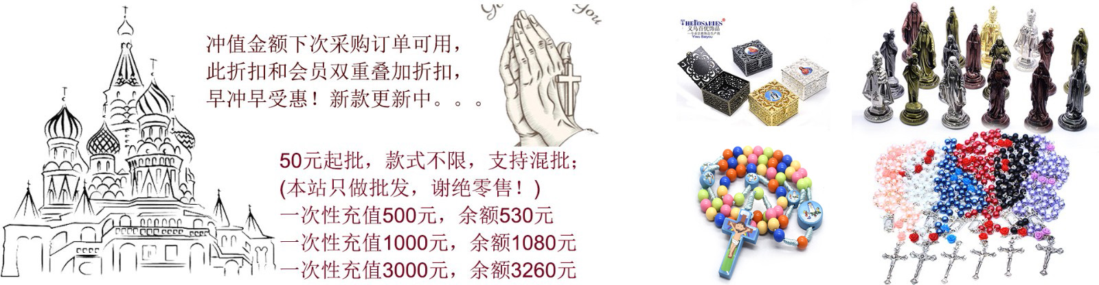 义乌百优饰品有限公司,十几年生产加工经验,手工工人100多号,注塑压铸机激光切割等配套机器。 专业生产念珠项链手链,十字架等文创类饰品,工艺品,为跨境电商外贸公司提供货源。 主要有:计数珠,念珠手链,念珠项链,十字架项链,十字架摆件,合金十字架,木制十字架,塑料十字架圣像摆件,包装盒,圣水瓶,烛台,仪式用品,婚礼,等礼品赠品。 另可承接锌合金新版开模压铸,塑料注塑,手工编制/弯针/挂圈类产品,按客户样品订制的文创类工艺品,外贸文创产品。诚招代理代销客户!