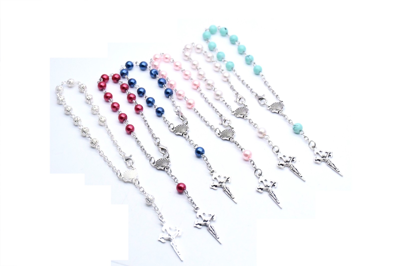 (银色白K)车挂十字珠念珠洗礼珠十字架手链Rosary bracelet