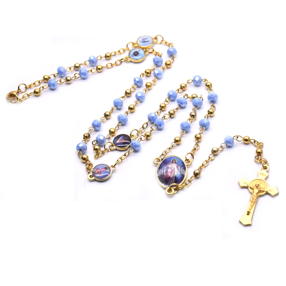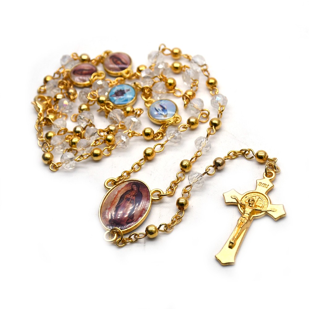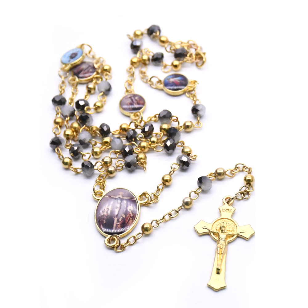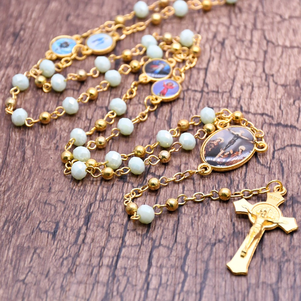 (橙)四圣像贴图金属珠水晶念珠十字架项链(图片随机)
