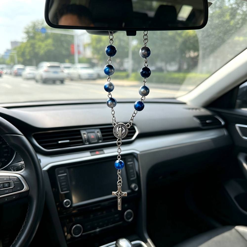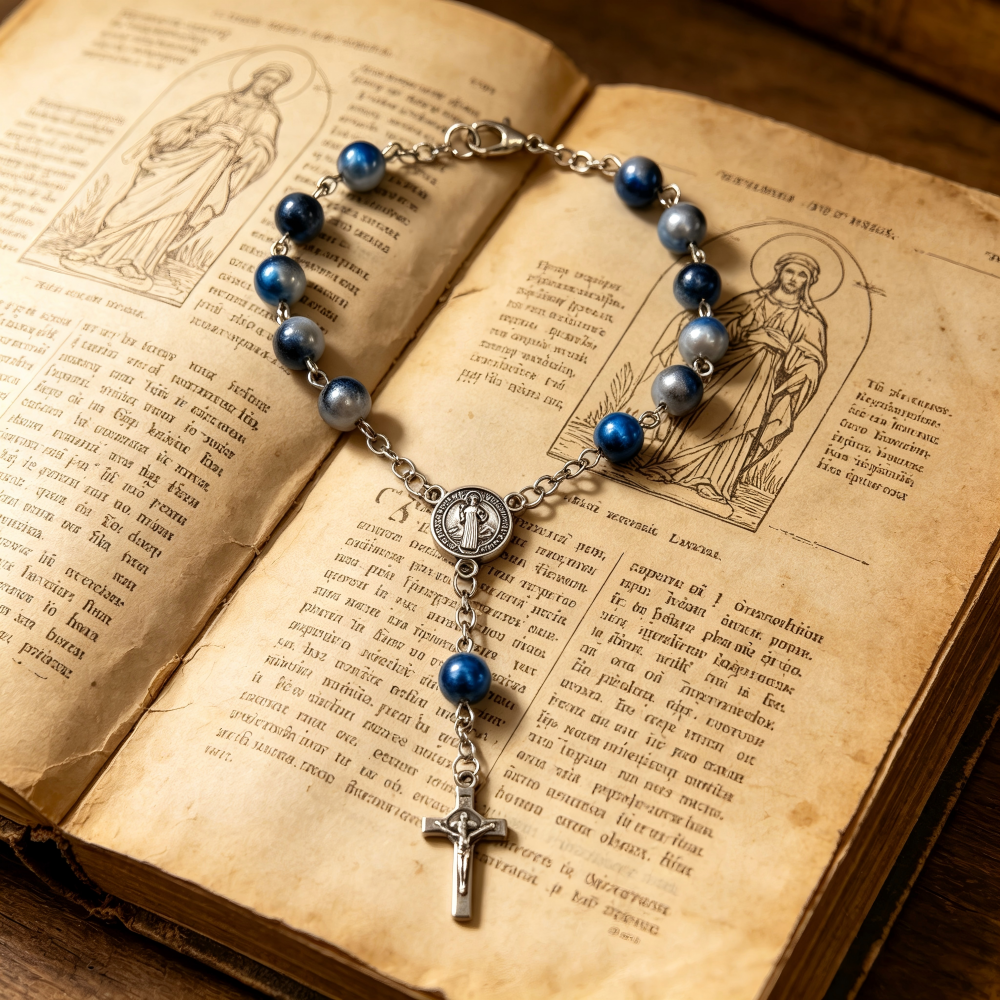 (蓝色)磨砂珠玫瑰经念珠手链 镀金镶钻爱心十字架饰品 洗礼礼物