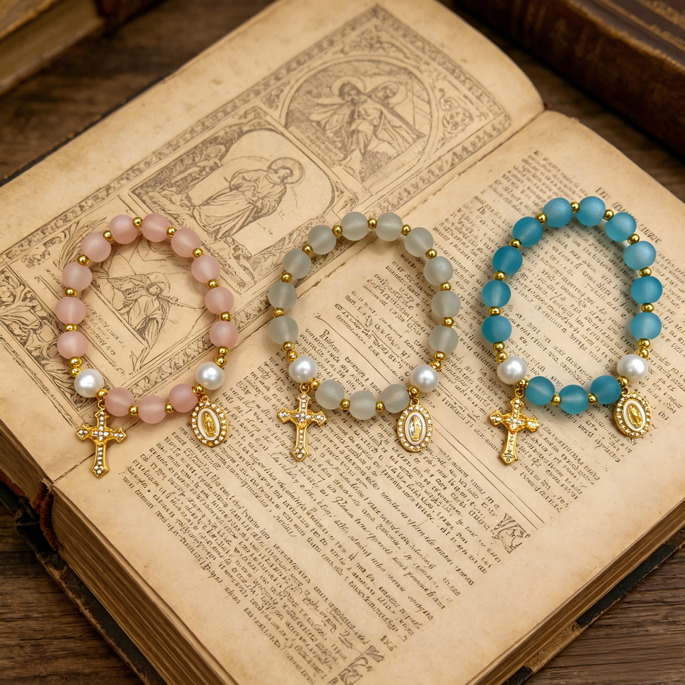(白色)磨砂珠玫瑰经念珠手链 镀金镶钻爱心十字架饰品 洗礼礼物