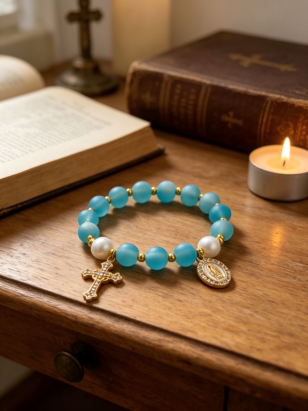 (蓝色)磨砂珠玫瑰经念珠手链 镀金镶钻爱心十字架饰品 洗礼礼物