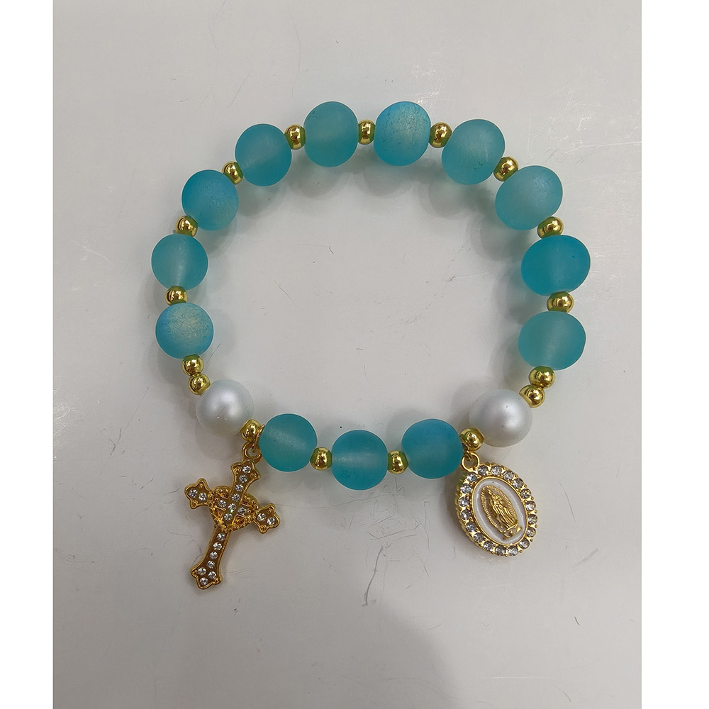 (蓝色)磨砂珠玫瑰经念珠手链 镀金镶钻爱心十字架饰品 洗礼礼物